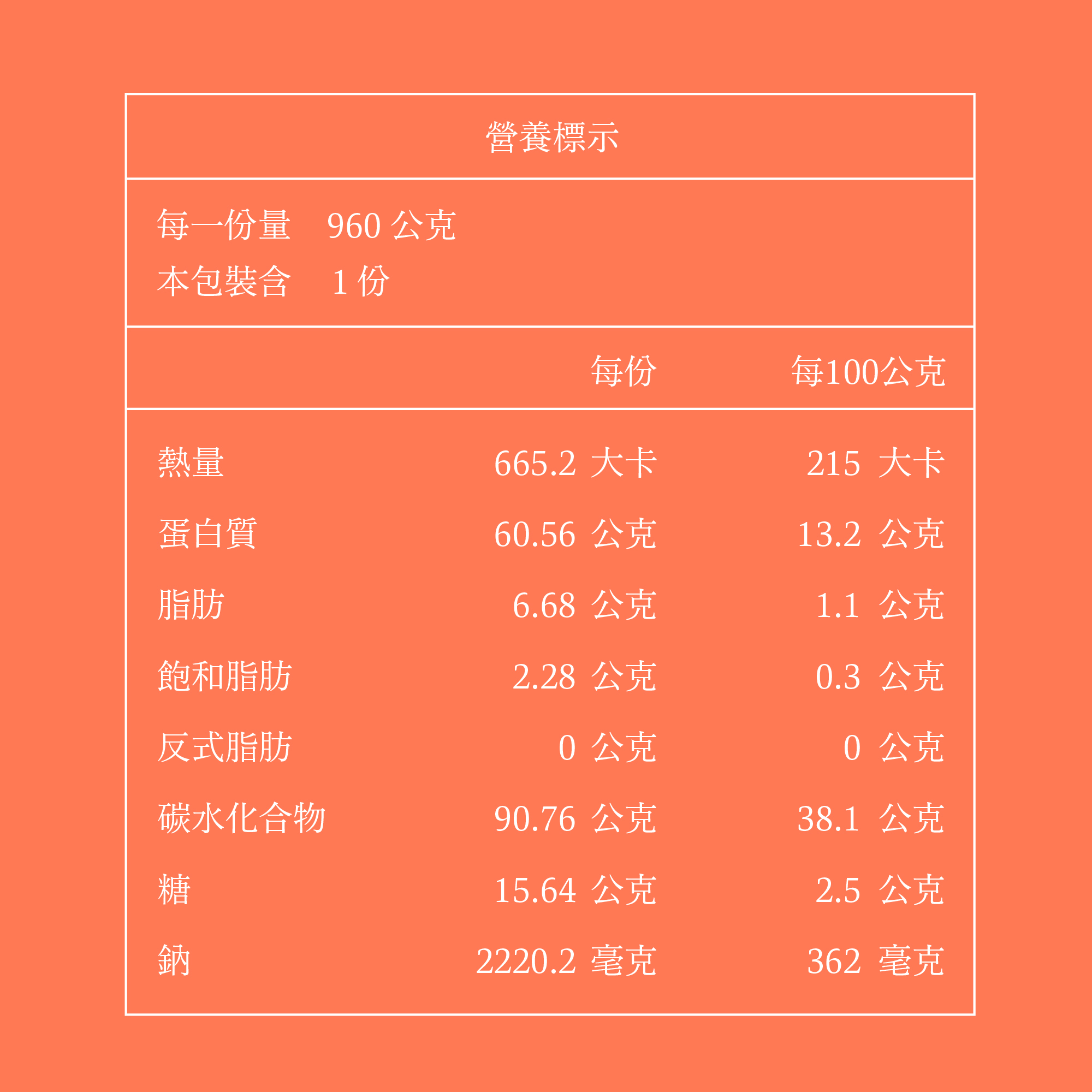 牛肉湯包成分:水、牛腱(巴拉圭)、牛筋(澳洲)、紅蘿蔔、番茄、胡椒粉、紅麴酒釀(紅麴、糯米、米酒)、紅蔥酥(蔥頭、棕櫚油、玉米澱粉)、豆瓣醬(辣椒、水、非基因改造黃豆、食鹽)、冰糖、黑糖蜜、醬油
