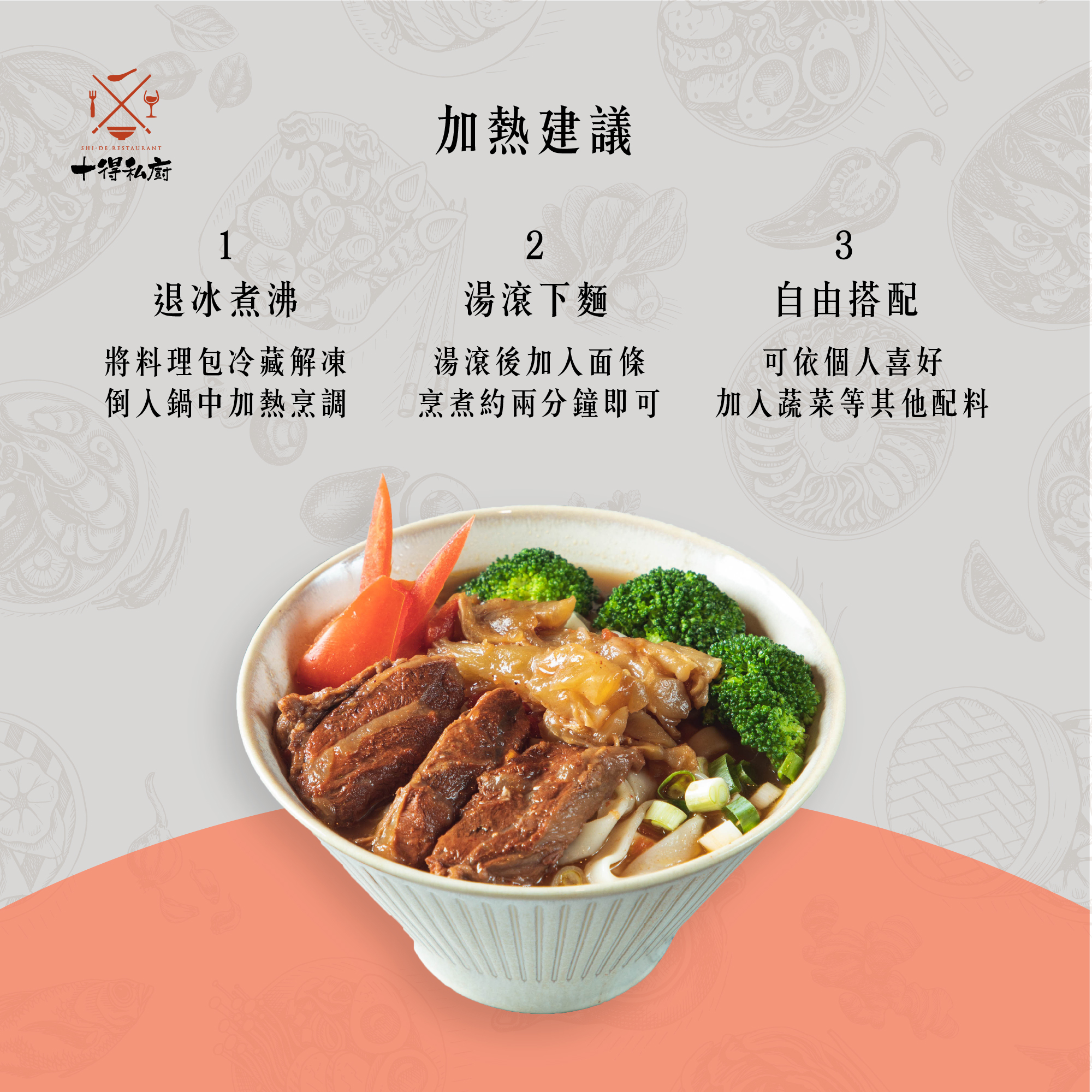 ● 將牛肉麵解凍後加熱煮沸,再加入麵條煮約兩分鐘即可享用美味的十得牛肉麵。