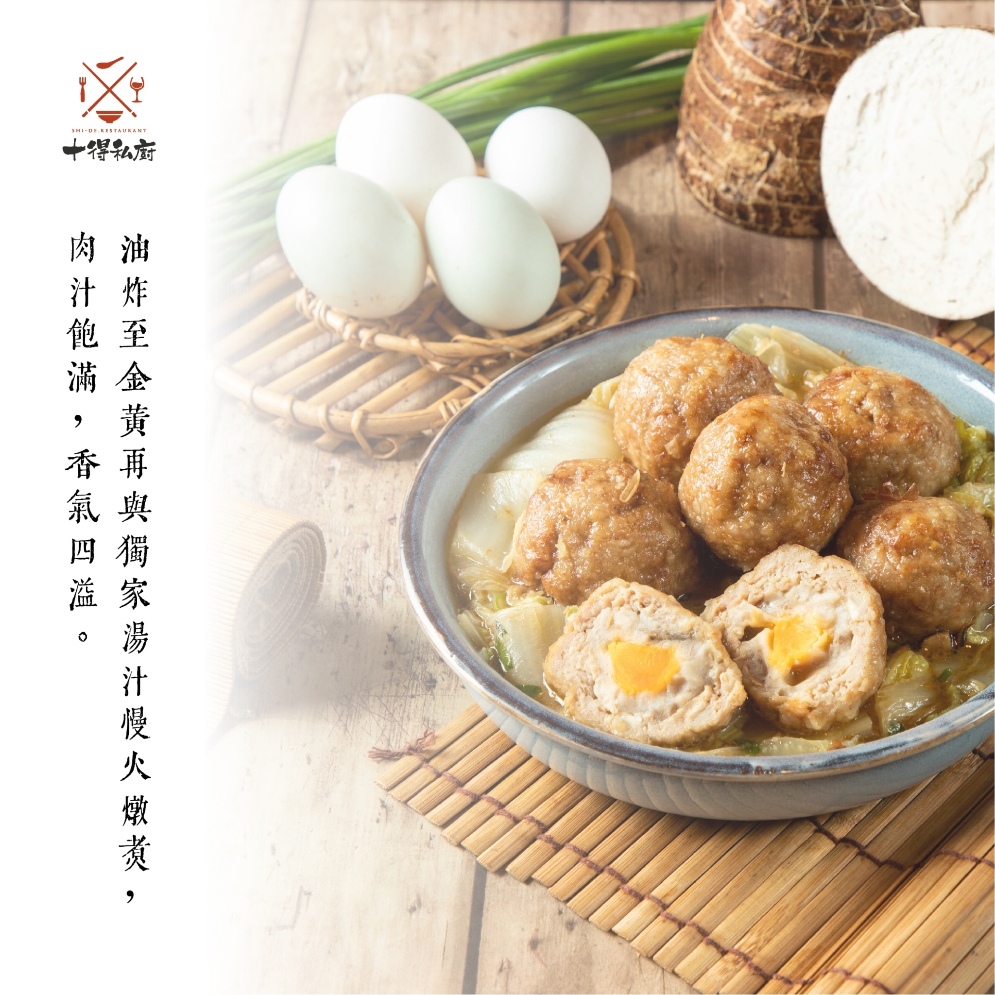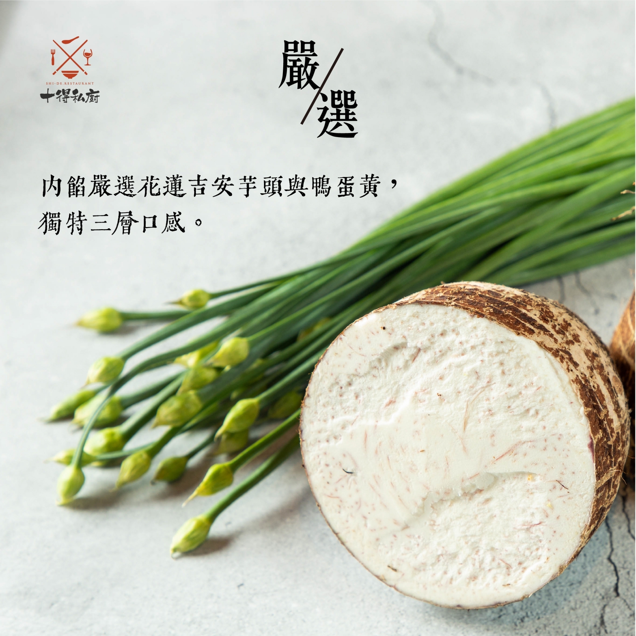 ● 內餡嚴選花蓮吉安芋頭包裹鴨蛋黃,獨特三層口感,嚴選食材完美融合,創造出十得紫芋金心獅子頭