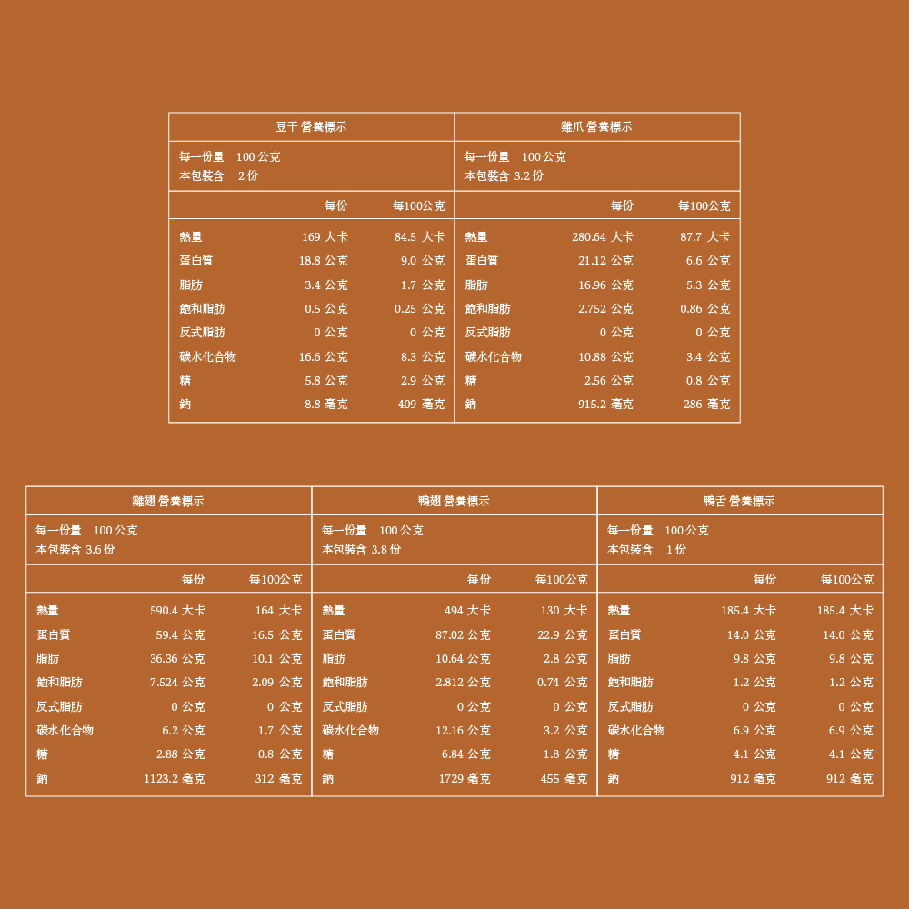 ● 豆干、雞爪、雞翅、鴨翅、鴨舌五種經典一次享受。