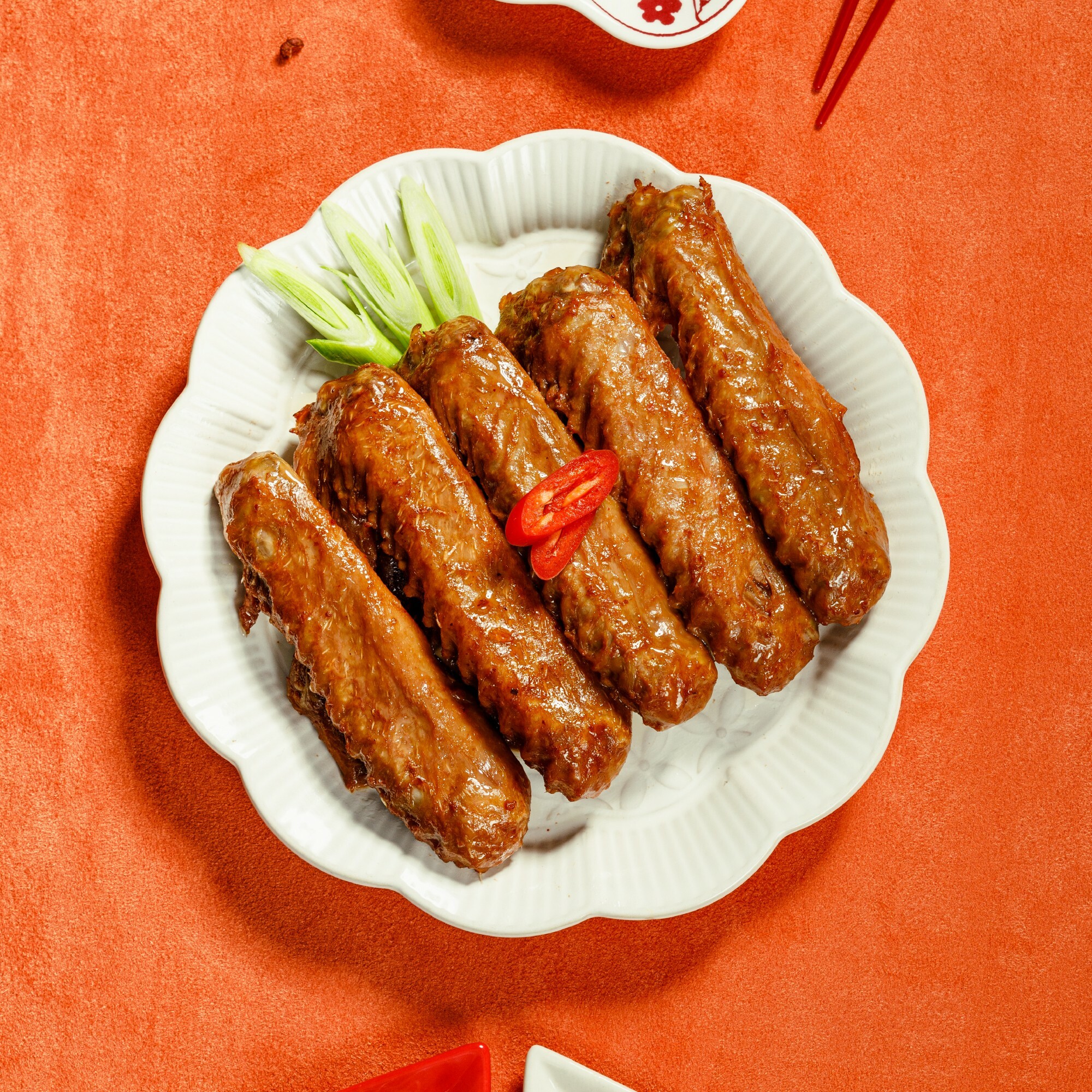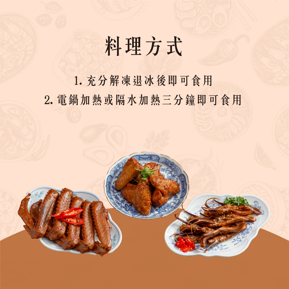 成分:CAS鴨翅(台灣)、水、純釀醬油、冰糖、麥芽糖、米酒、豆瓣醬(辣椒、水、非基因改造黃豆、食鹽)、蔥、薑、蒜、胡椒粉、辣椒、八角、甘草、花椒、肉桂。
