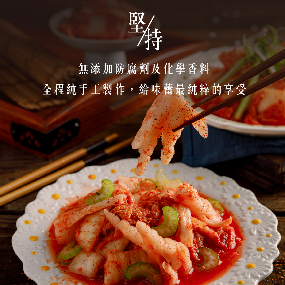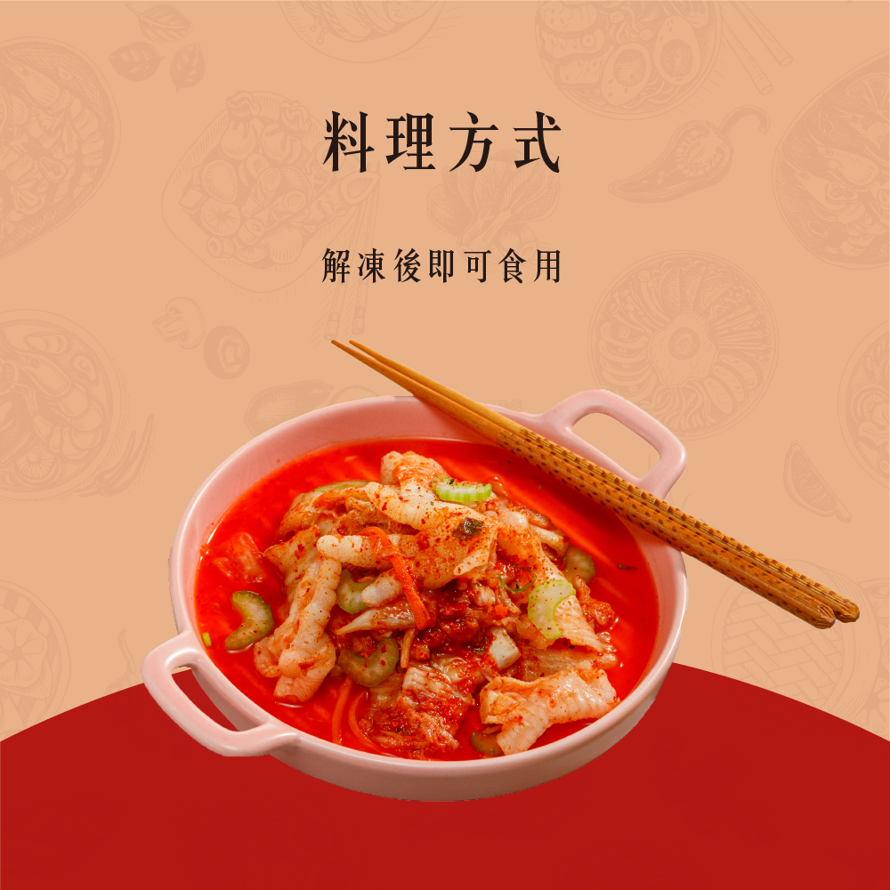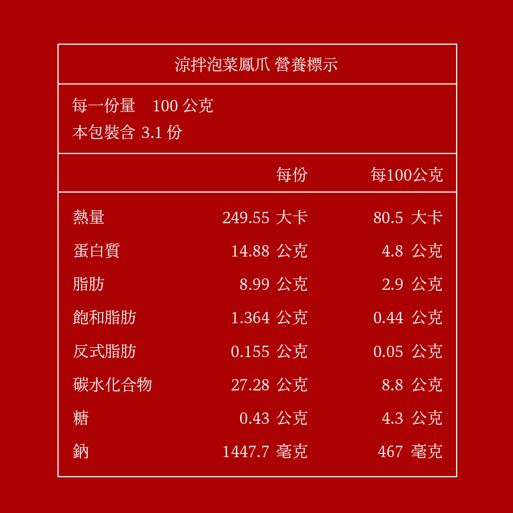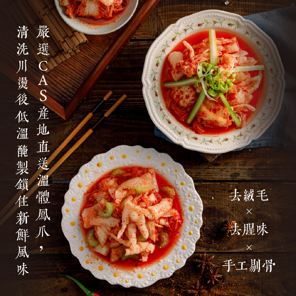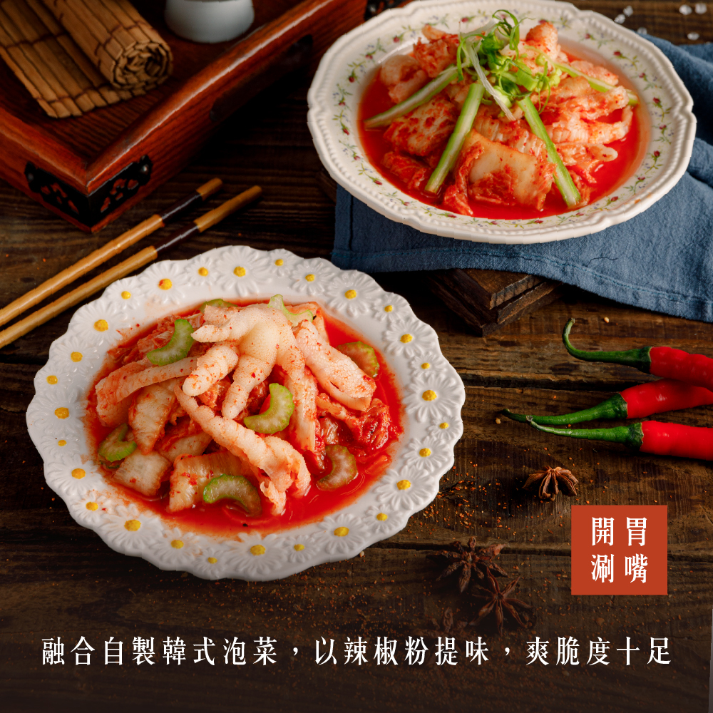 成分:CAS去骨雞腳、大白菜、紅蘿蔔、蒜頭、辣椒粉、白醋、糖、黑麻油、鹽、米酒