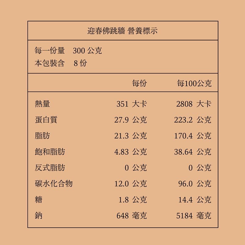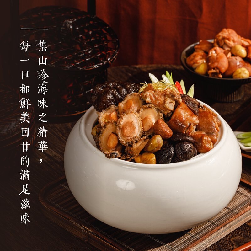 成分:豬腳、嫩排骨、魚皮、鮑魚、海參、豬肚、栗子、芋頭、脆筍、乾香菇、草菇、生香菇、冬粉翅、蒜頭、純釀淡醬油、胡椒粉、櫻花蝦、柴魚、烏醋、油蔥酥、紅露酒、鹽。