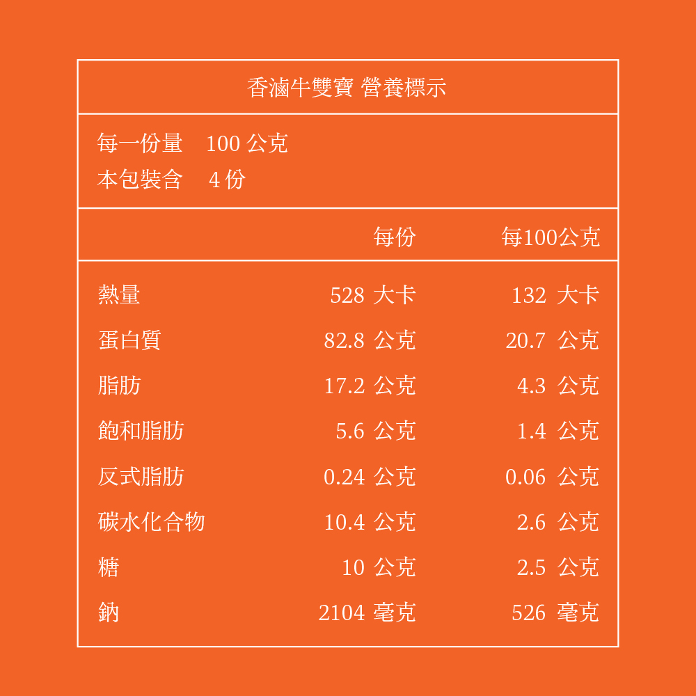 成分:牛腱(巴拉圭)、牛肚(澳洲)、水、純釀醬油、冰糖、麥芽糖、米酒、豆瓣醬(辣椒、水、非基因改造黃豆、食鹽)、蔥、薑、蒜、胡椒粉、辣椒、八角、甘草、花椒、肉桂。