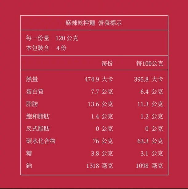 淨重:460公克(麵體85公克+麻辣醬包30公克)x4包