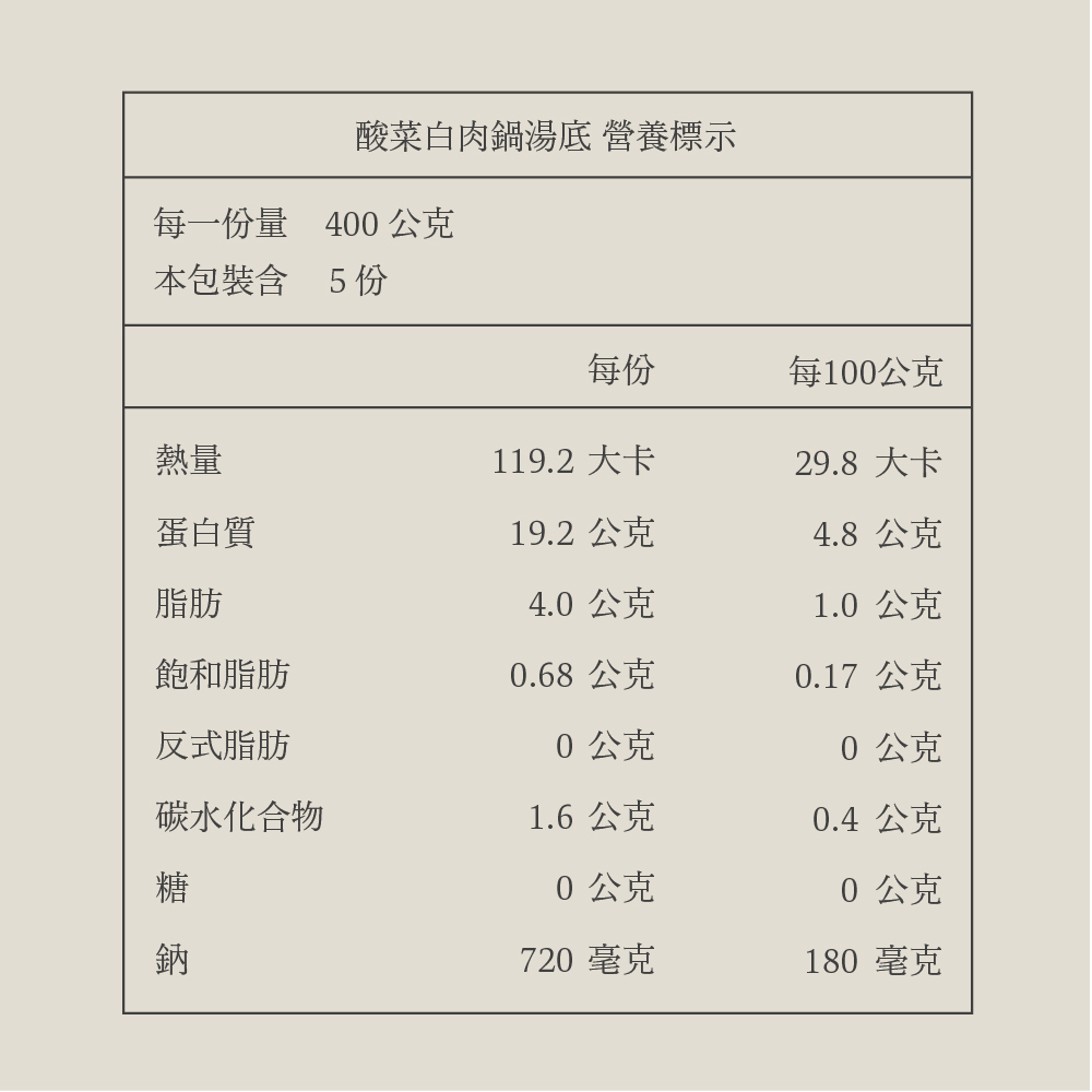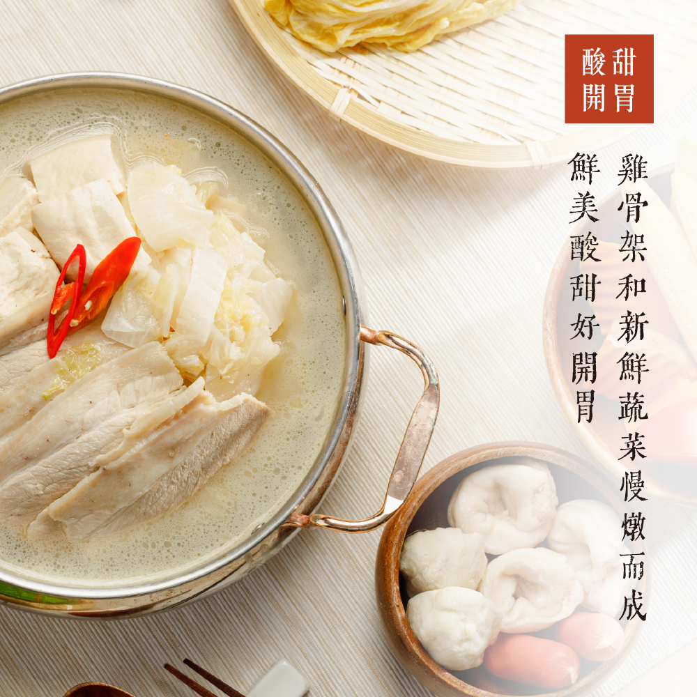 成分:豬大骨(台灣)、雞骨湯底、三層肉片(台灣)、酸白菜、凍豆腐