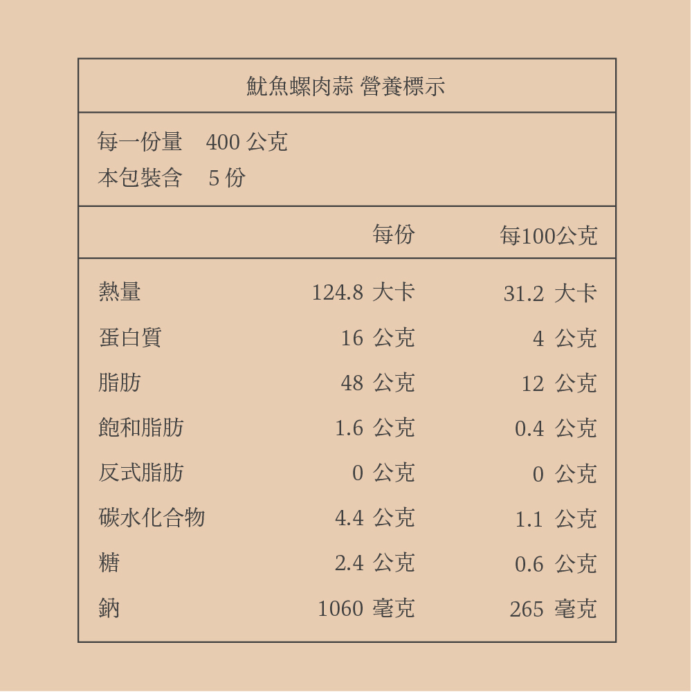 過敏原資訊:本產品含酒、海鮮、螺貝類、麩質穀物及其製品
