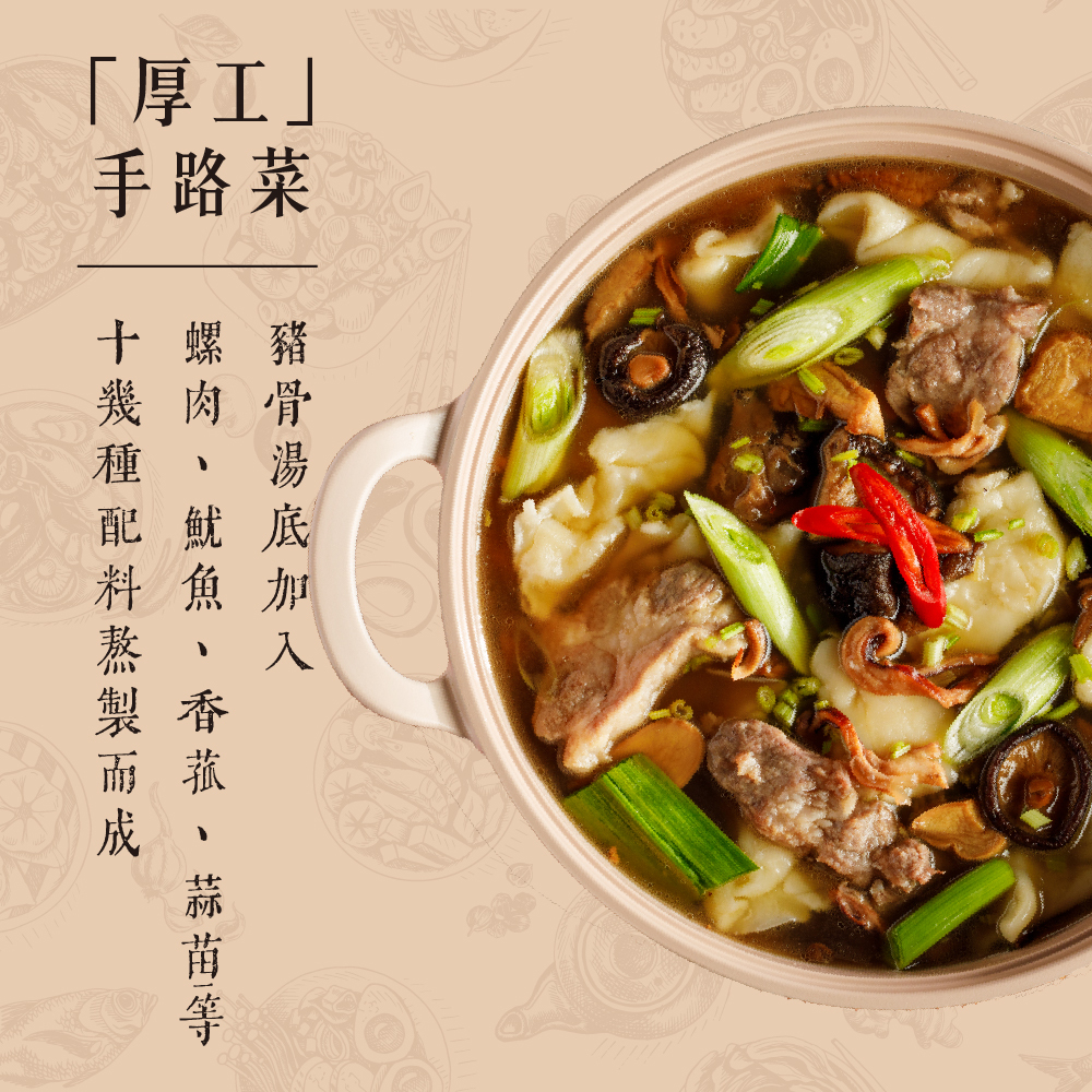 ● 味覺層次豐富 加入自製麵疙瘩 ,每一口都有獨特風味作法「厚工」手路菜 ,在家就能享用。